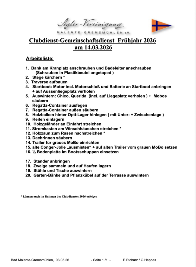 am Samstag, 14.03.2026, wird das Clubgelände am Kellersee für die neue Segelsaison vorbereitet und aus dem „Winterschlaf“ geholt.